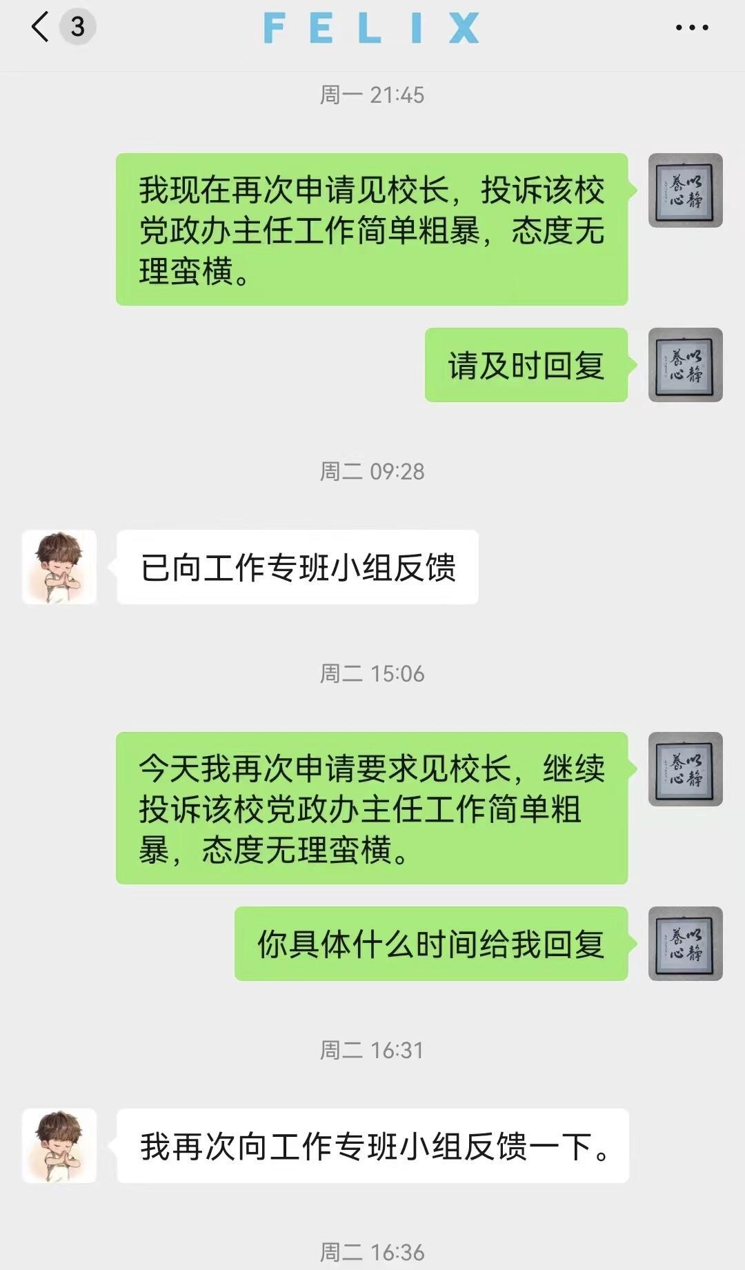 在芦彦辰家属与学校老师的聊天记录中,家属多次向学校申请见校长。老师回复称“已向工作专班小组反馈”“ 我再次向工作专班小组反馈一下”“建议您把诉求和依据准备好,我一并汇报给专班小组”“单纯见校长并不能算作一个合理的诉求,应该提出具体诉求并附材料”。