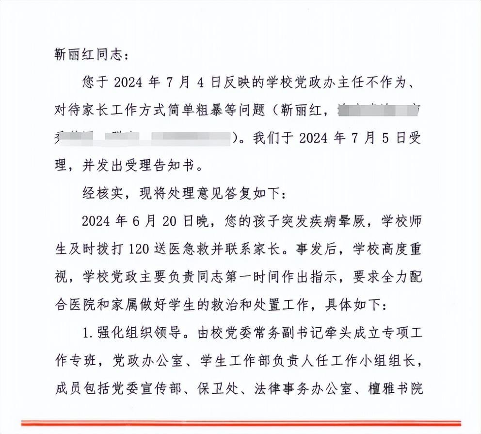 7月10日,海南大学法律事务办公室(信访室)出具的处理意见书称,孩子突发疾病晕厥后,“学校高度重视,学校党政主要负责同志第一时间作出指示,要求全力配合医院和家属做好学生救治和处置工作。”