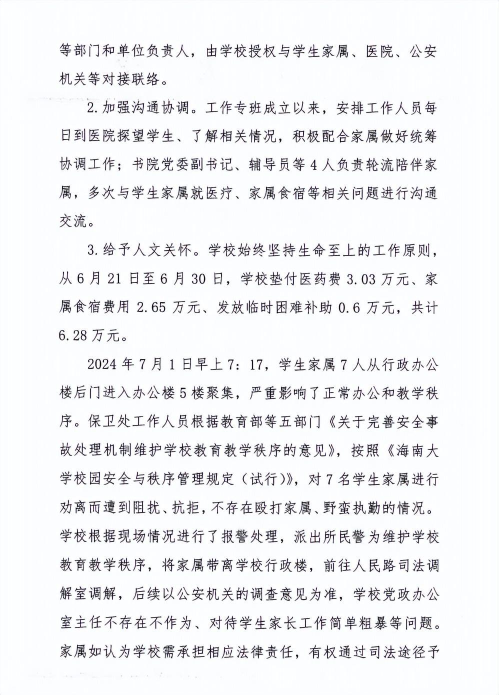 学生家属向学校投诉后,海南大学法律事务办公室出具处理意见书称,家属如果认为学校需承担相应法律责任,有权通过司法途径予以解决。