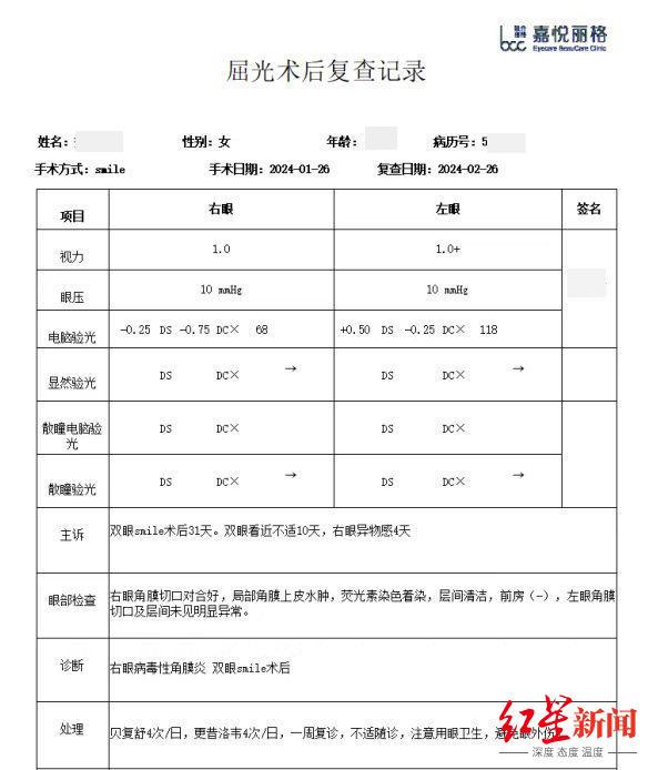 阿敏称,之后按照院方的“术后用药提示”将眼药用完后,于术后一个月回到嘉悦丽格眼科复查,被诊断为右眼病毒性角膜炎。几天后,其左眼也被确诊感染。