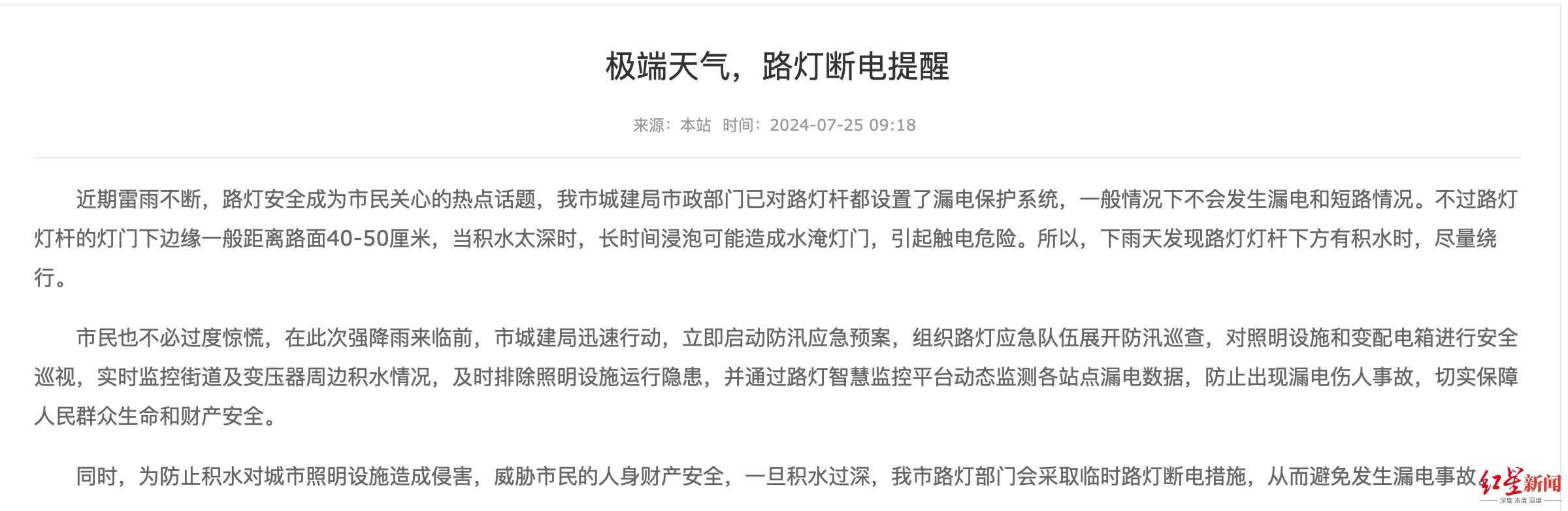 住房城乡建设部今年3月发布《关于做好2024年城市排水防涝工作的通知》中要求:加强易积水区域城市基础设施的巡查检修,防止路灯灯杆等市政设施因积水发生漏电事故。应急管理部也在今年7月12日发布了雨天城市内涝避险提示:尽量避开电线杆、变压器、电力线、铁栏杆及附近的树木等有可能连电的物体,以防触电;发现有电线落入水中,必须绕行并及时报告相关部门。