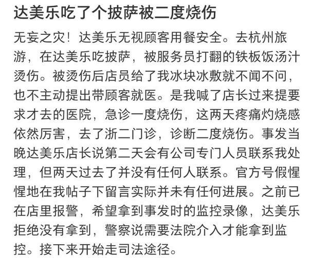 8月13日,#吃达美乐被烫成二度烧伤#冲上热搜。据媒体报道,7月底,一女子在杭州旅游时,到一家达美乐门店吃披萨,被店员打翻的铁板饭汤汁烫伤,医生诊断为二度烧伤,被迫滞留当地。事发后,该女子想申请5000元赔偿用于后续治疗。然而,达美乐官方账号回应称已经退还了餐费,支付了医药费,并称女子的伤只是“最轻级”,无法支付更多赔偿。