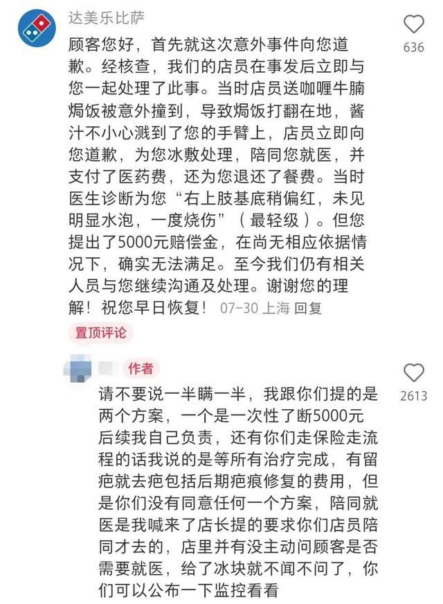 报道显示,7月30日,达美乐官方账号向当事人致歉,承认确有店员意外烫伤顾客一事。“当时店员送咖喱牛腩焗饭被意外撞到,导致焗饭打翻在地,酱汁不小心溅到了您的手臂上,店员立即向您道歉,为您冰敷处理,陪同您就医,并支付了医药费,还为您退还了餐费。当时医生诊断为您‘右上肢基底稍偏红,未见明显水泡,一度烧伤’(最轻级)。但您提出了5000元赔偿金,在尚无相应依据情况下,确实无法满足。”