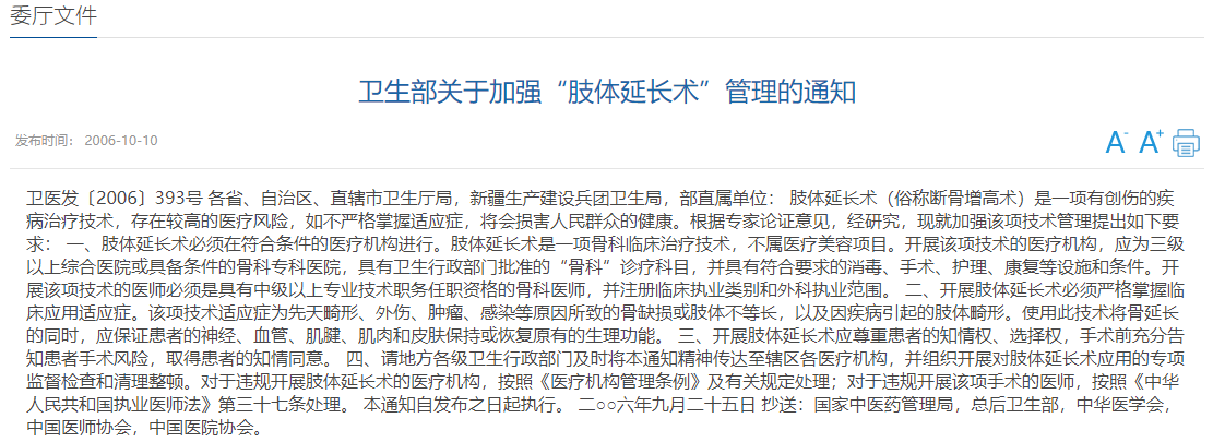 早在2006年,原卫生部就出台了《关于对“肢体延长术”实施严格管理的通知》,通知规定该项技术适应证为先天畸形、外伤、肿瘤、感染等原因所致的骨缺损或肢体不等长,以及因疾病引起的肢体畸形。不具备以上适应证的,严格禁止使用肢体延长术;严禁用于美容项目。