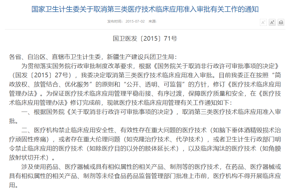 2015年,原国家卫计委下发通知,医疗机构禁止临床应用安全性、有效性存在重大问题的医疗技术(如脑下垂体酒精毁损术治疗顽固性疼痛),或者存在重大伦理问题(如克隆治疗技术、代孕技术),或者卫生计生行政部门明令禁止临床应用的医疗技术(如除医疗目的以外的肢体延长术),以及临床淘汰的医疗技术(如角膜放射状切开术)。