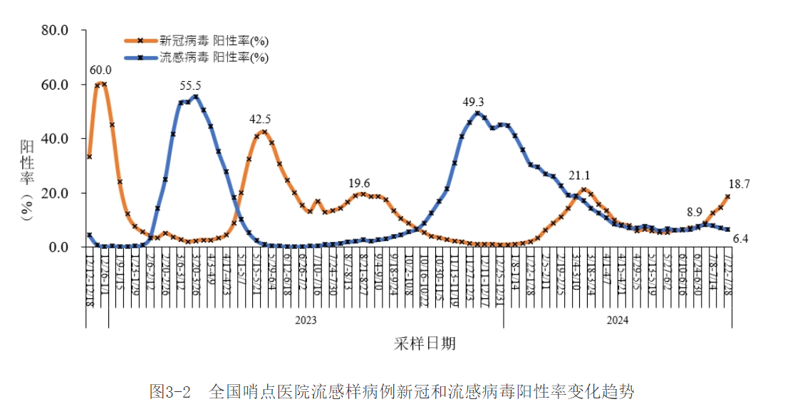 中国疾控中心8月8日发布的全国新冠病毒感染数据也证实了上述情况。数据显示,全国哨点医院流感样病例新冠病毒阳性率从第27周的8.9%持续上升至第30周的18.7%。7月,全国共报送7042例本土病例新冠病毒基因组有效序列,均为奥密克戎变异株。主要流行株为JN.1系列变异株和XDV系列变异株;全国新增新冠肺炎重症病例203例、死亡病例2例(其中新冠病毒感染导致呼吸功能衰竭死亡病例0例、基础疾病合并新冠病毒感染死亡病例2例)。