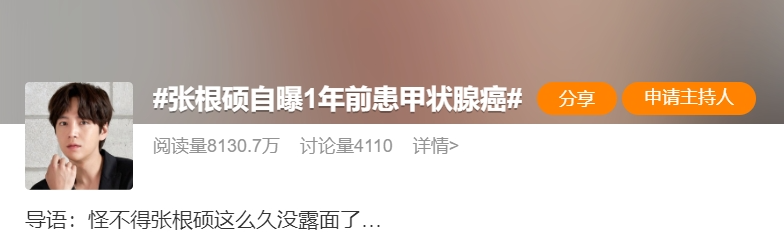 张根硕在社交媒体公开承认曾患有甲状腺癌,为了不让粉丝担忧,他特意等到手术结束两周后才发布视频。