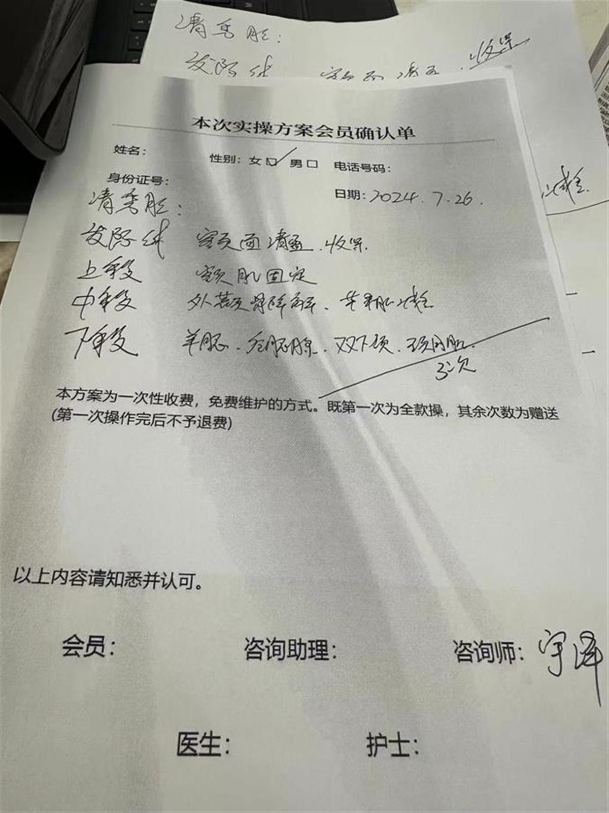 “回想这件事,除了收费和做项目的机构主体都不一样外,我觉得还有很多蹊跷的地方,比如收费后不能开具正规的发票;给的“清秀脸”项目方案只写在一张白纸上,实操方案上没有医生的签名,只有一个咨询师的签名;‘爱尔菲琳’也没有现场验真伪……”杨女士称,这让她想起来后怕不已,疑消费的医美项目被医美机构层层转包。
