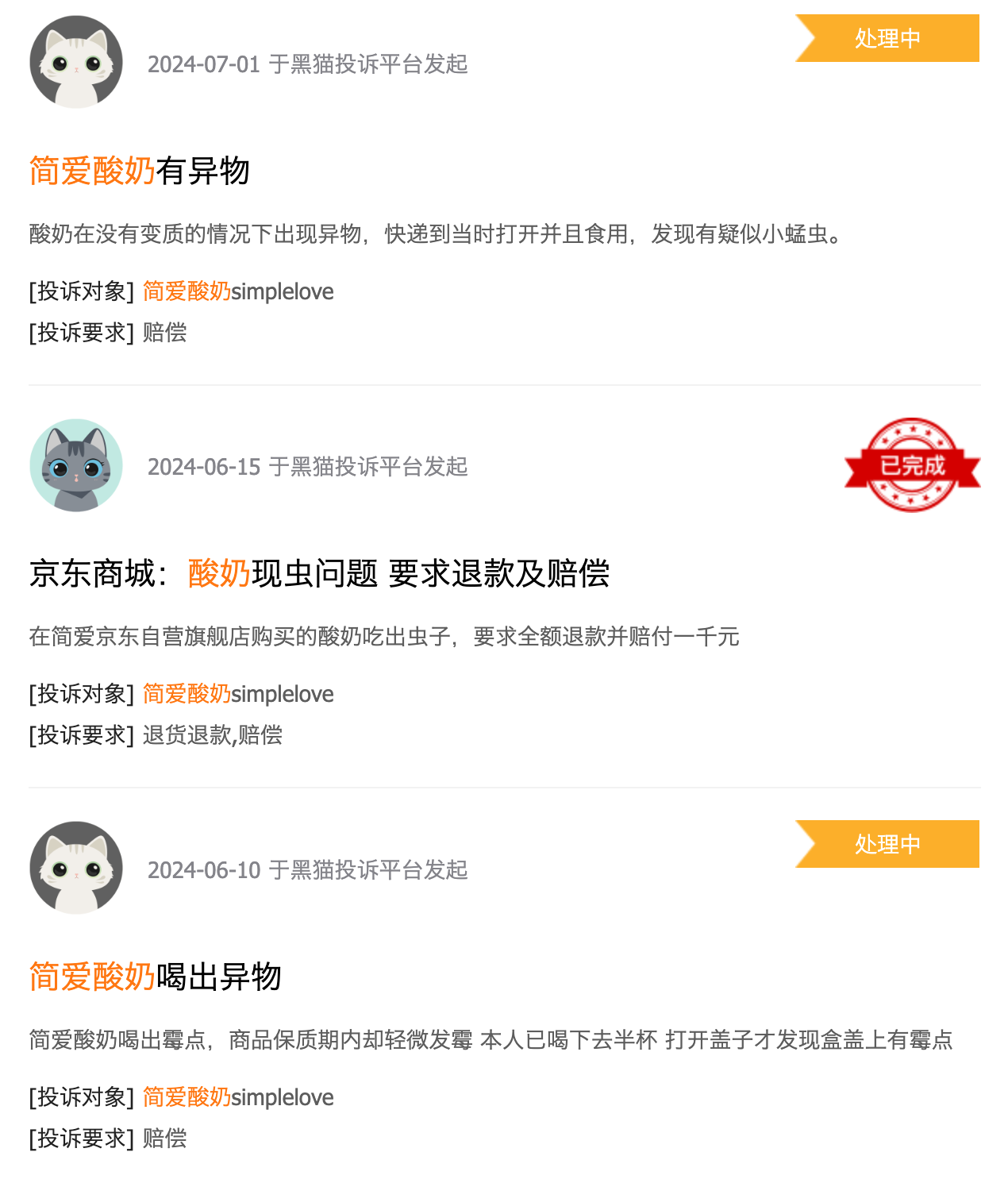 记者梳理发现,这已经不是简爱酸奶第一次出现食品安全争议。早在2020年,就有消费者因发现简爱酸奶中出现疑似“虫卵”,向市场监督管理部门进行投诉。尽管简爱在最终的检测报告中排除了“异物”为虫卵的可能,但消费者仍对该品牌的质量问题存有疑虑。直至今日,黑猫消费者平台上仍有不少关于简爱酸奶出现“虫子”“异物”的投诉。
