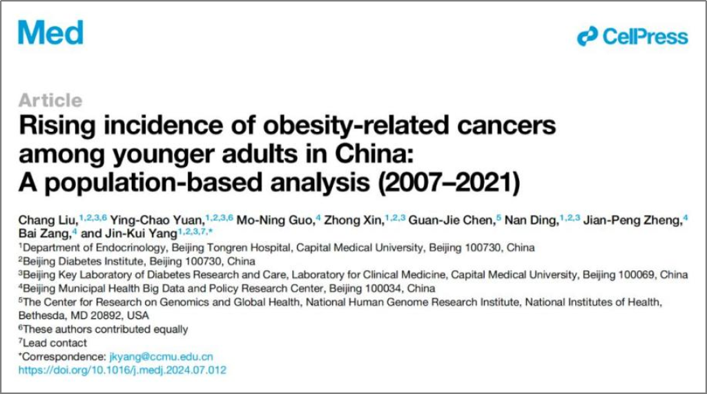 8月23日,北京同仁医院杨金奎教授团队在细胞出版社(Cell Press)旗下期刊Med上发表研究论文。该研究显示,2007年至2021年间,中国人的肥胖相关癌症发病率以惊人的速度增长(年增长率达3.6%),而肥胖无关癌症发病率则保持稳定。而且,这一增长在年轻人中尤为明显。