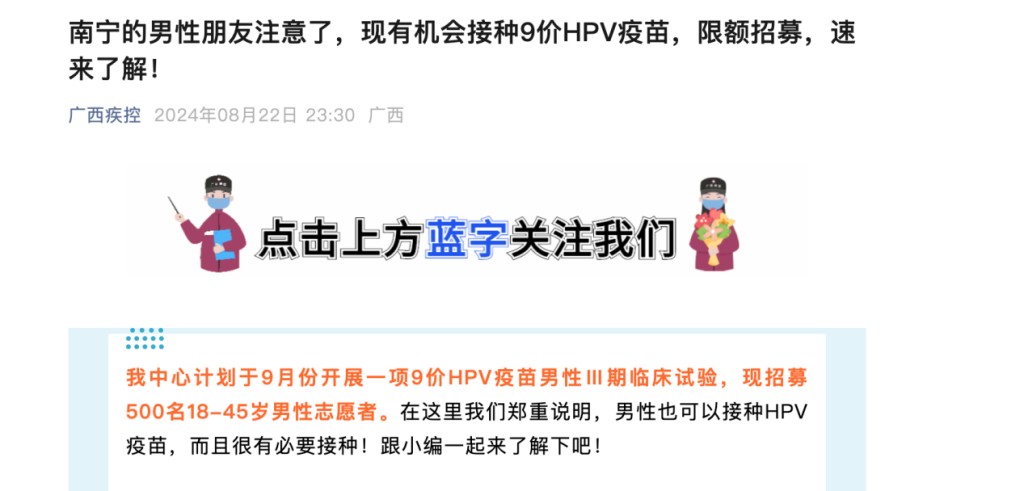 广西疾控8月22日发布消息,广西壮族自治区疾病预防控制中心9月份将开展一项HPV疫苗男性三期临床试验,试验涉及一款国产九价疫苗,将在6年内对500位试验参与者进行随访。不少网友都期待男性能在国内打上人乳头瘤病毒(HPV)疫苗。