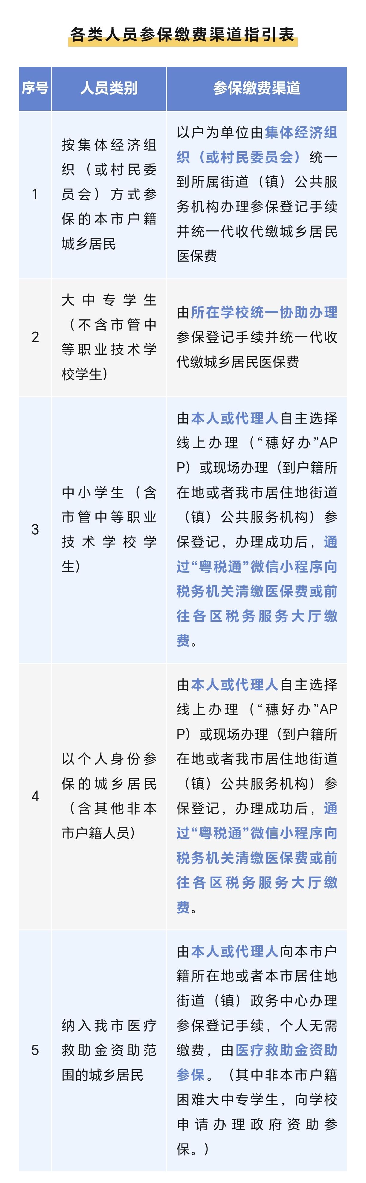 二、中小学生参保:为确保学生顺利参保,医保、教育及税务等部门将于2024年9月至12月期间,通过数据共享完成学籍信息采集与验证。确认无误后将发送税务机关征收医保费,并通过预留电话发送缴费通知。请家长及学生密切关注短信通知,及时完成缴费。同时,家长也可选择前往街道(镇)公共服务机构或使用“粤医保”微信小程序主动确认学生身份。