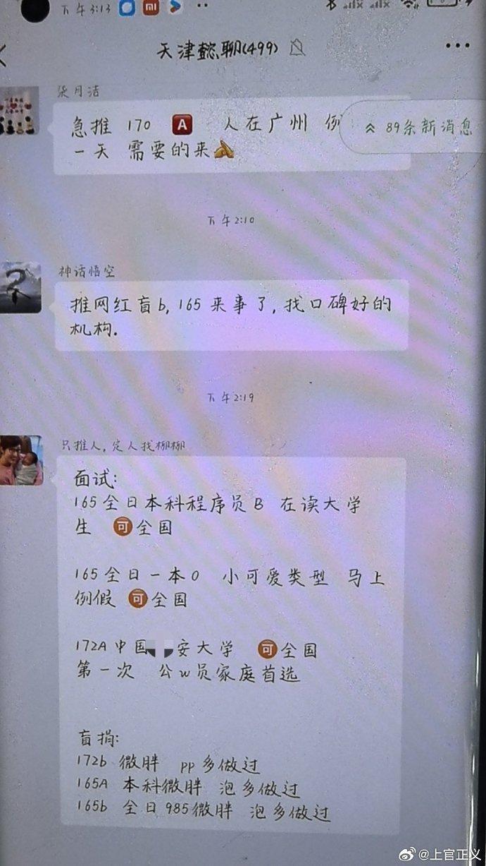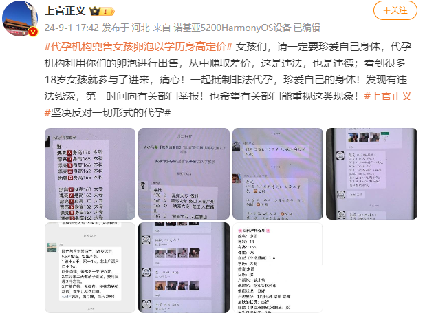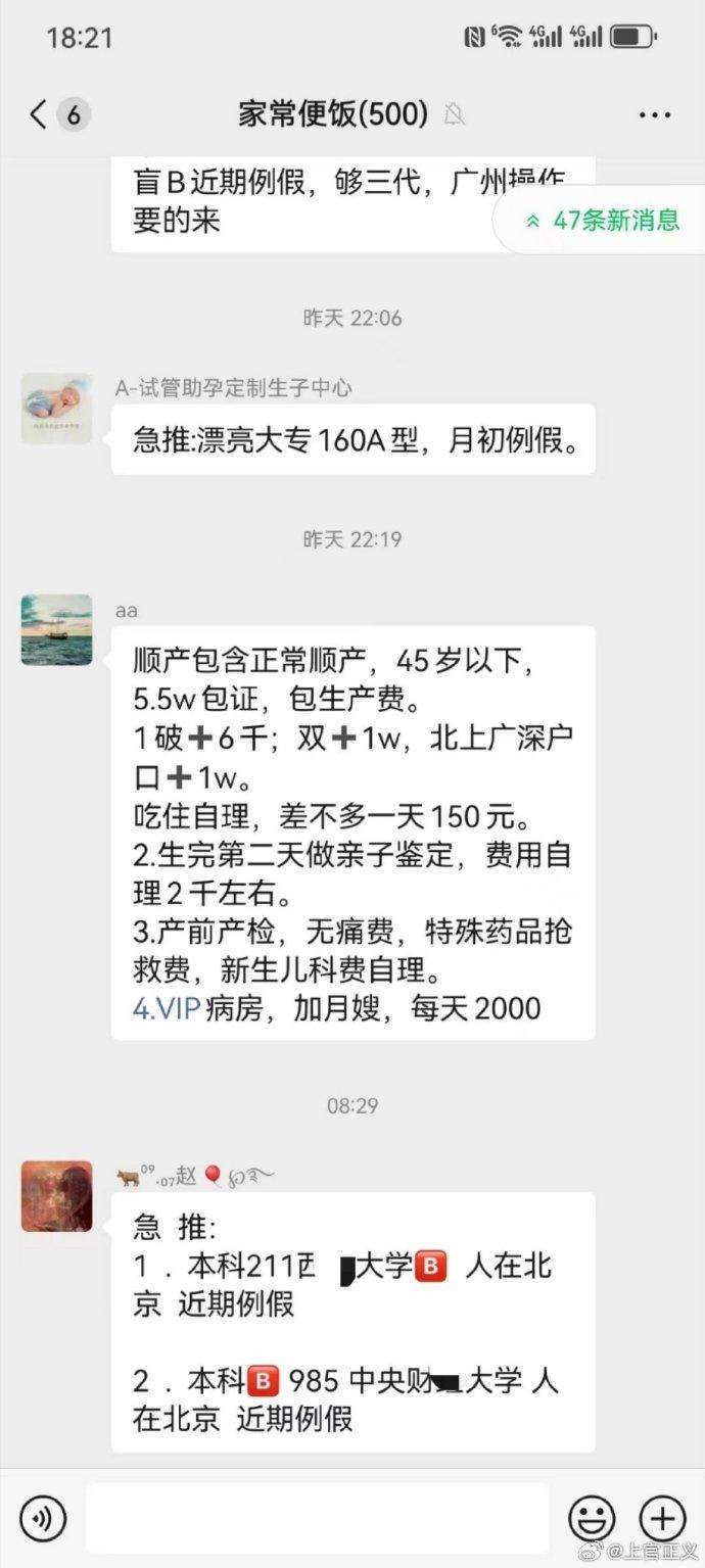 9月1日,知名打拐志愿者@上官正义曝光非法代孕机构群聊内容,按长相、学历、身高等将女性分门别类,明码标价出售卵泡,其中不乏来自本科,以至985、211大学的相关售卖信息。