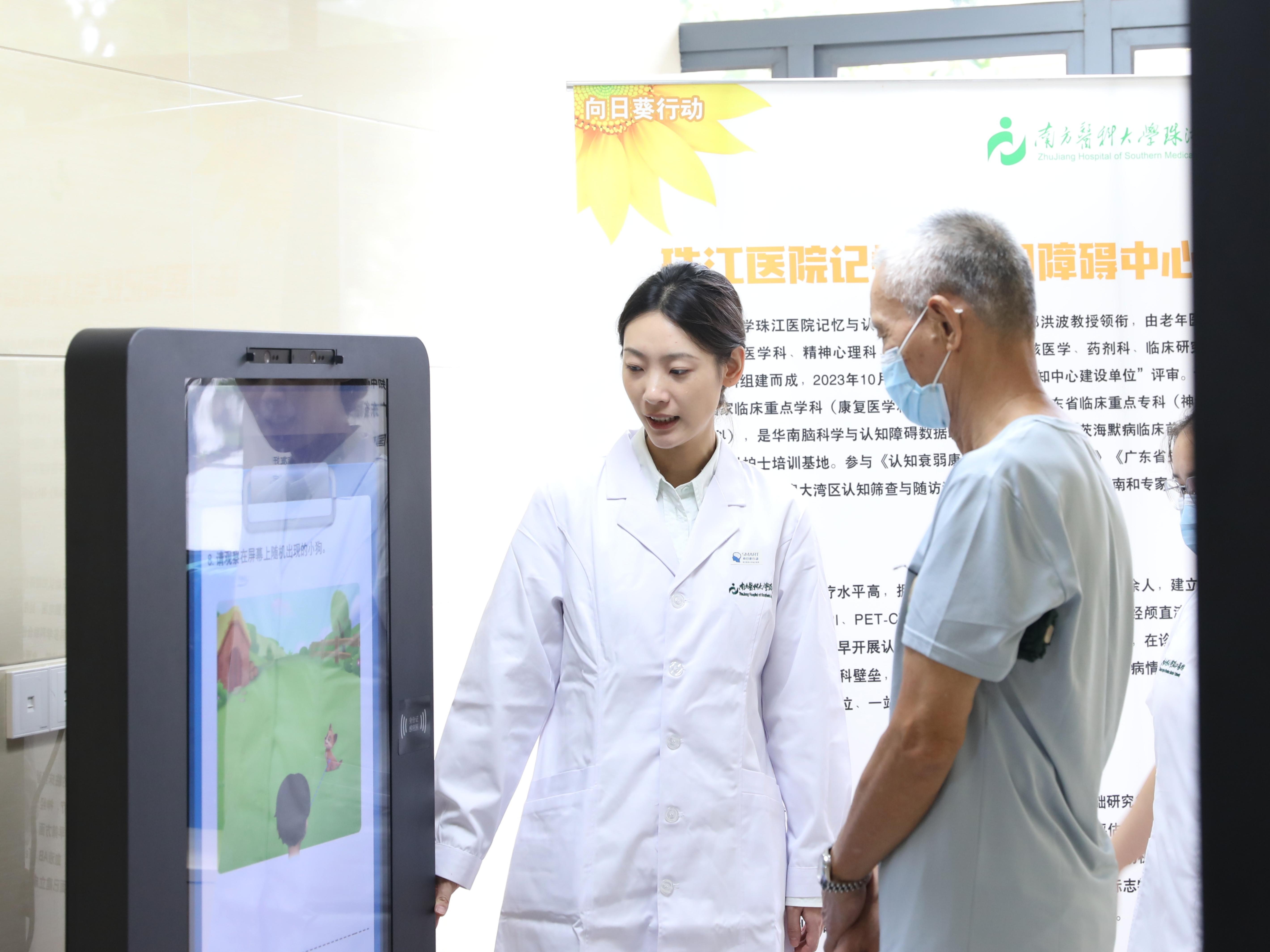 老人在液晶智慧屏幕上完成几个人机互动小游戏,5分钟后就可以拿到脑健康状况的初步评估!9月6日,南方医科大学珠江医院“向日葵行动——SMART互动式AI认知早筛系统在阿尔茨海默病社区筛查中的应用”活动在海珠区沙园社区卫生服务中心举行。