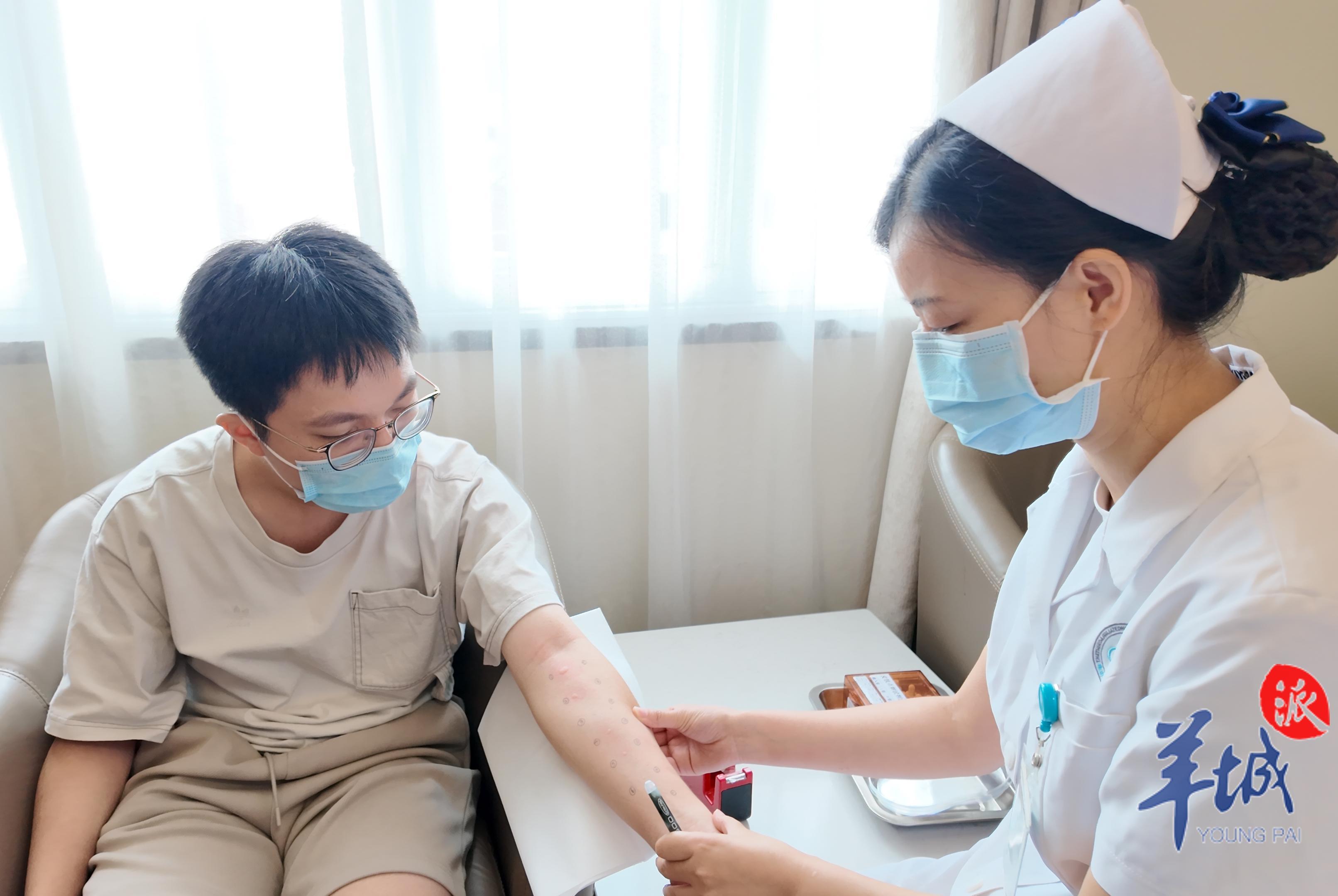 除了尘螨与动物毛屑,杧果(常用名:芒果)花粉也是南方地区特色的一大室外过敏原。目前,除了常规的尘螨、动物毛屑等过敏原检测,中山三院过敏科也增加了南方特色杧果花粉的吸入性过敏原皮肤点刺试验,该试剂正是该团队研发的最新成果之一。记者探院时,一位青年男子正在进行过敏原皮肤点刺试验,用点刺针轻轻地扎破皮肤,15分钟之后便可观察结果。