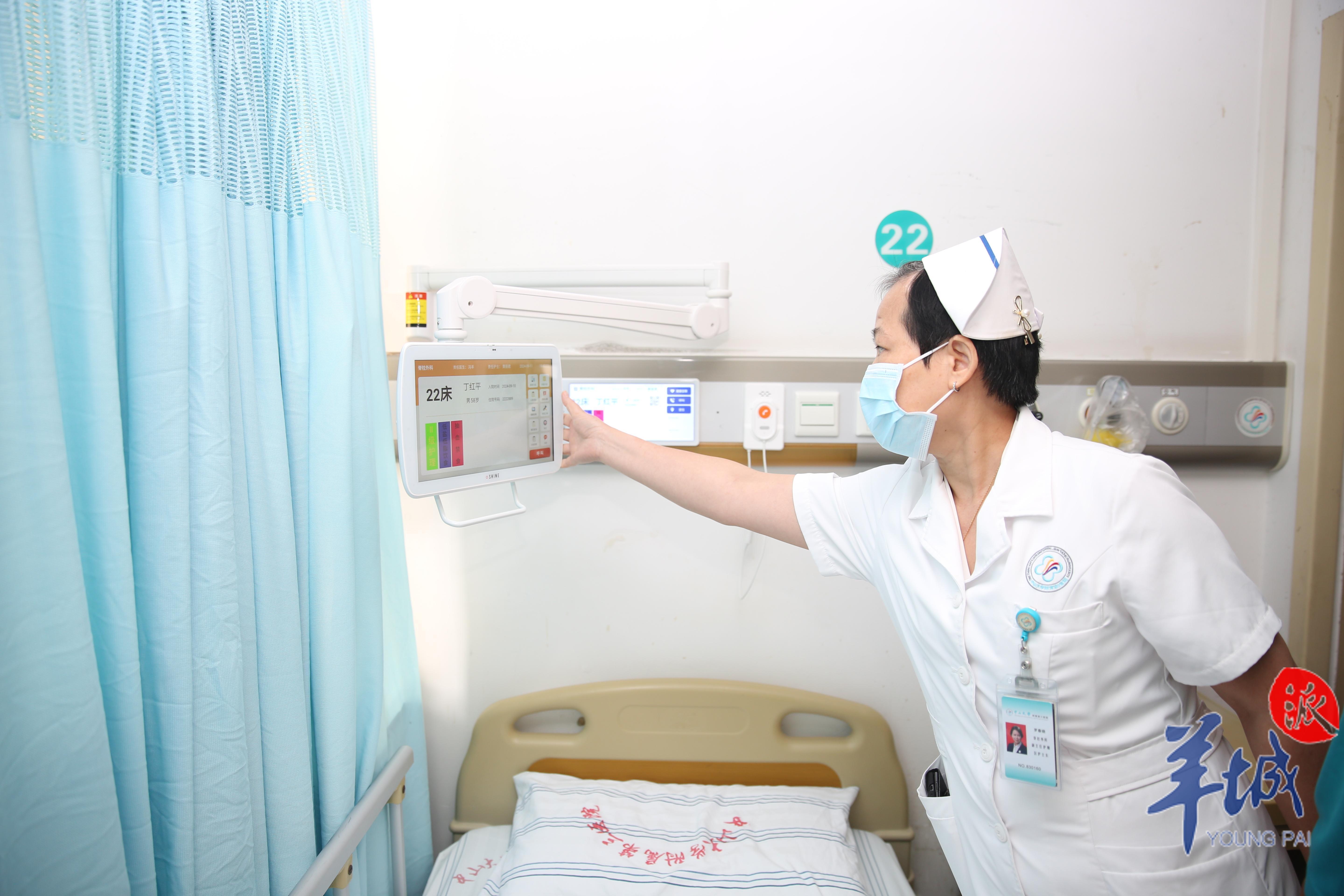 在中山三院脊柱外科病房里,贾叔看着自己病床前的交互电子设备,便对自己的病情一目了然。电子屏上显示,他需要明天抽血禁食,属于Ⅱ级护理,建议低盐低脂饮食……