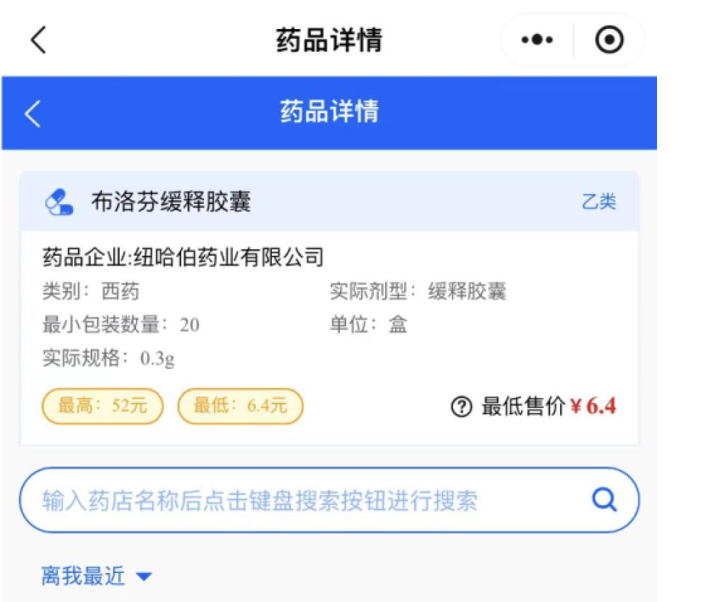 据介绍,“江苏药价通”可根据价格、药店位置距离对查询药品进行排序,并显示同一药品在用户城市的最低价、最高价。记者查询发现,以纽哈伯药业的布洛芬缓释胶囊(最小包装数量20粒/盒,规格0.3克)为例,不同药店的最高售价为52元,最低售价为6.4元。