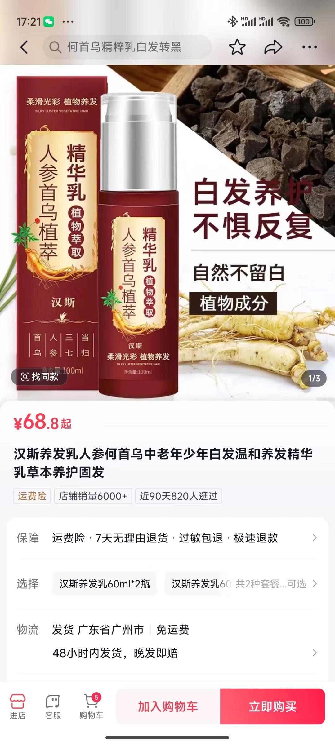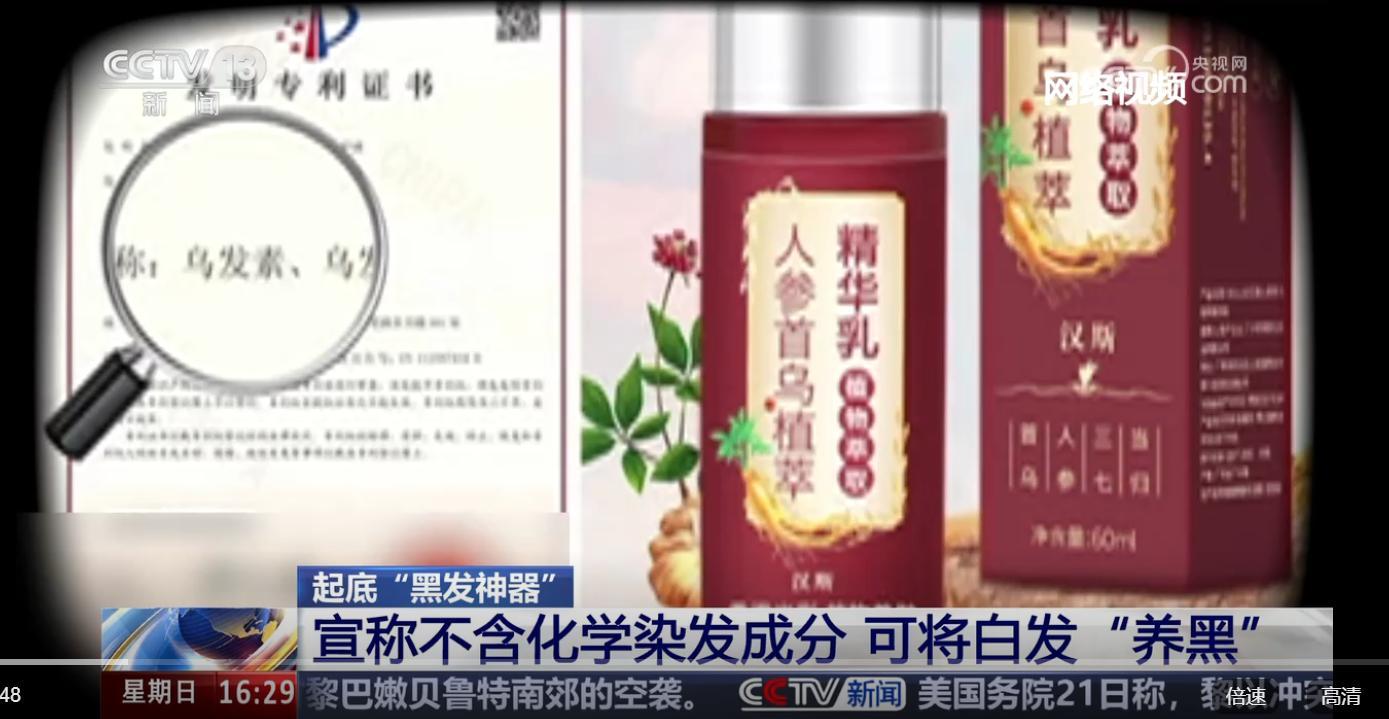 这类“白转黑”养发产品目前网上销售情况如何?记者在某短视频平台和某网购平台上,以“白转黑”为关键词搜索,轻松查询到一大批广告语为“白转黑”“不染发”“自然转黑”“三天转黑”等的产品。记者看到,在这两个平台上“汉斯”系列产品不少,其中一款产品“汉斯人参首乌植萃”与央视重点曝光的产品“汉斯人参首乌养发乳”包装和商品名称类似。