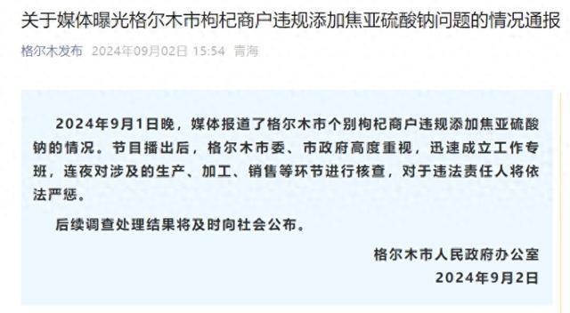 9月初,记者曝光了青海省海西蒙古族藏族自治州格尔木市、甘肃省白银市靖远县的枸杞生产区存在违规违法生产加工、使用工业硫磺熏制枸杞等问题。9月2日,青海格尔木市人民政府办公室发布情况通报称,已成立工作专班连夜核查,对于违法责任人将依法严惩。2日上午,甘肃省白银市靖远县也就该事件发布了情况通报。两地均称后续调查处理结果将及时向社会公布。