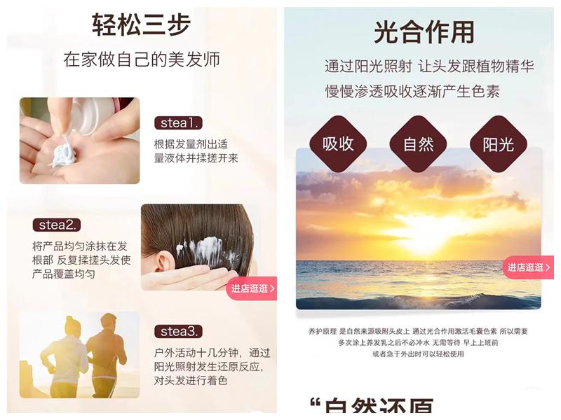记者看到,这款名为“汉斯人参首乌植萃”的产品号称“白发养黑”“植物成分”“采用多种植物萃取”,产品介绍一再强调“光合作用”,“通过阳光照射,让头发跟植物精华慢慢渗透吸收逐渐产生色素”“户外活动十几分钟,通过阳光照射发生还原反应,对头发进行着色。”
