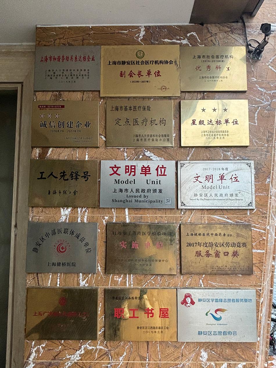 9月25日下午4时许,记者来到位于静安区中兴路上的上海健桥医院。医院的入口处挂着十几块铭牌,包括“上海市基本医疗保险定点医疗机构”“上海市静安区社会医疗机构协会副会长单位(2023-2027)”“工人先锋号”等。