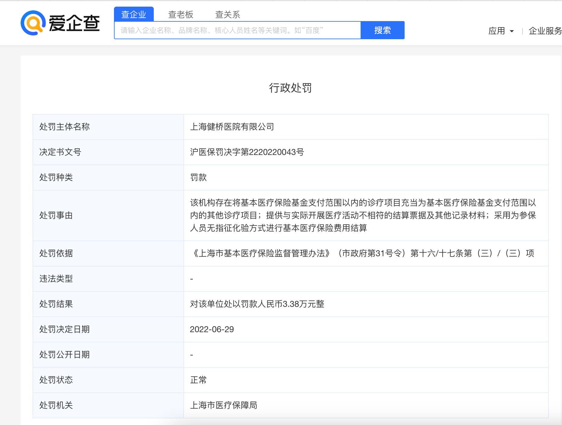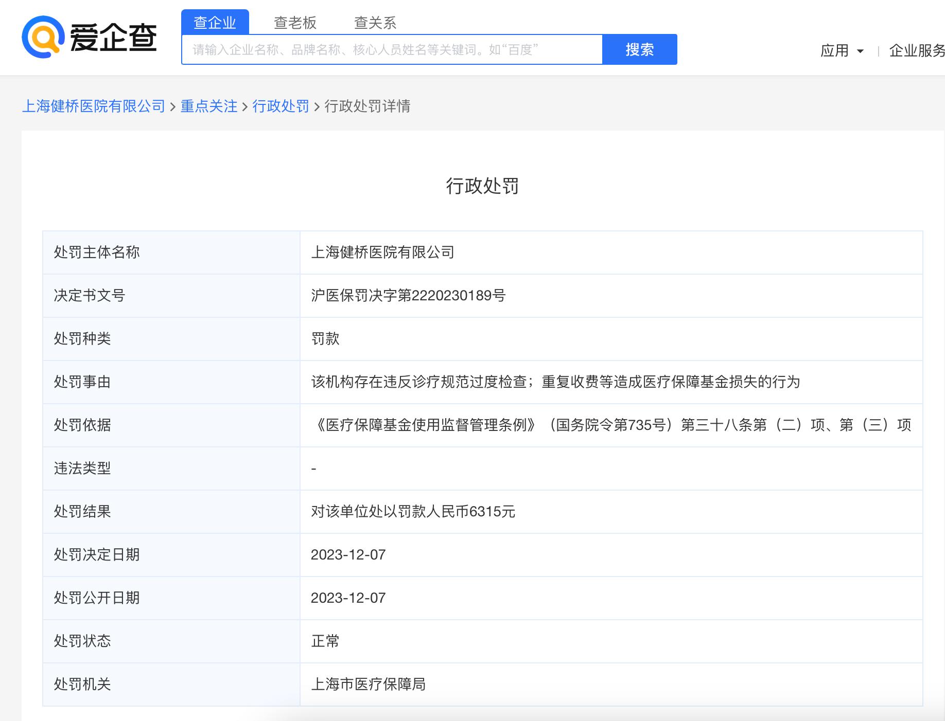记者搜索爱企查发现,2022年至2023年期间,上海健桥医院曾数次因过度检查、重复收费、超标准收费等违规使用医保基金问题而被罚。