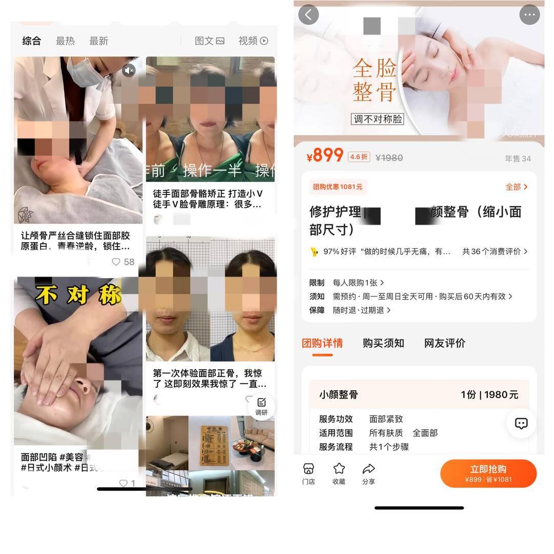 除了体态调整,正骨美颜“刮起的风”更大:“保住青春,让颅骨严丝合缝锁住面部胶原蛋白”“徒手面部骨骼矫正,打造小V脸”“大小脸第一次体验面部正骨,即刻效果惊了!”……记者注意到,正骨项目只要涉及养颜,价格均不菲。南京一家热门“整骨养颜”店铺,团购体验一次需889元。该店铺工作人员告诉记者,虽然价格不低,但效果要比普通美容店好很多,因为店铺主打医学加美容,通过调整骨骼、肌肉,让面部更端正、轮廓线更好看,“不夸张地说,定期做脸会变小,还有美颜的效果。”