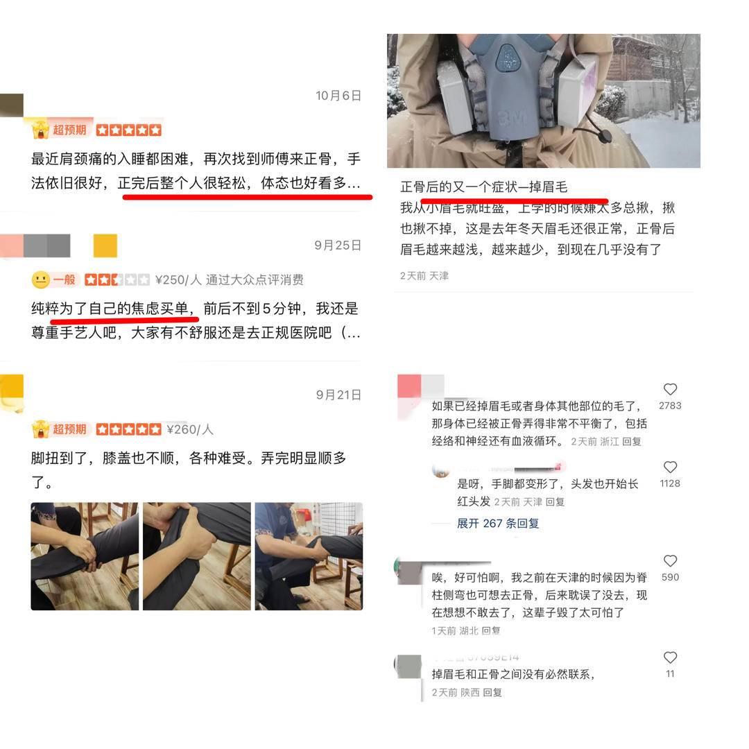 有人称正骨“一次见效”,有人却极力劝退!记者注意到,有关“正骨后遗症”的讨论在社交平台一直不断。近日,一网友自述,自从正骨后,出现手脚变形、身体疼痛,甚至开始掉眉毛了。在评论区,不少人颇有共鸣,并认为正骨会影响经络血液循环等。