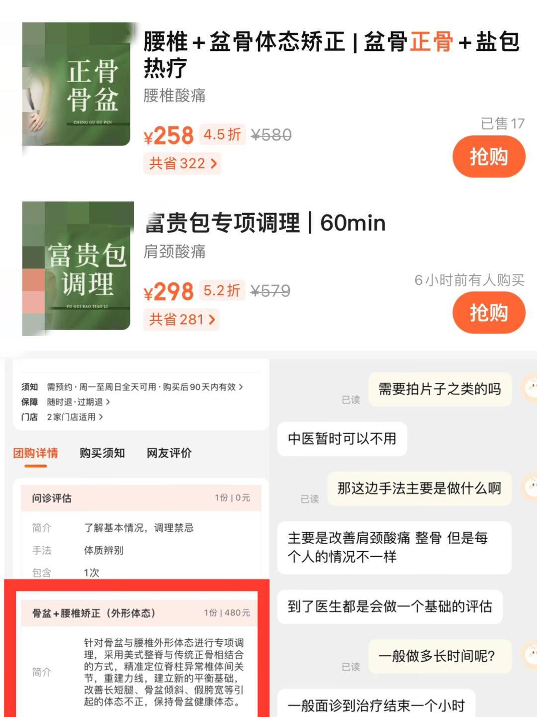 11日,记者以患者的身份咨询了这家养生馆,并询问具体的治疗手法有哪些?面诊时是否需要拍片子?客服回复称,主要是改善腰颈酸痛,正骨效果因人而异,中医暂时不需要拍片,并强调店里中西医都有,建议前来面诊后再做评估,“至于疗效,轻症患者一般3次左右见效,一次面诊+治疗约1小时。”按照团购价,富贵包专项调理298元/次,腰椎骨盆体态调整258元/次。