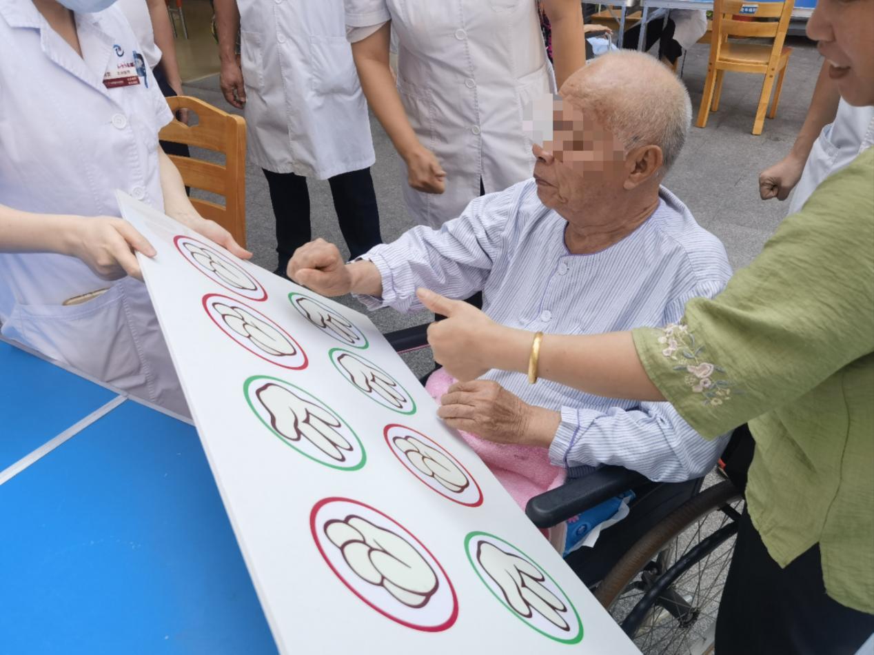 反应拍拍手、夹乒乓球等互动现场欢声笑语不断,老人们在周围的声声“点赞”“好棒”中,欢快地拍手做动作、专注地夹乒乓球,锻炼自己的反应能力与身体协调性。