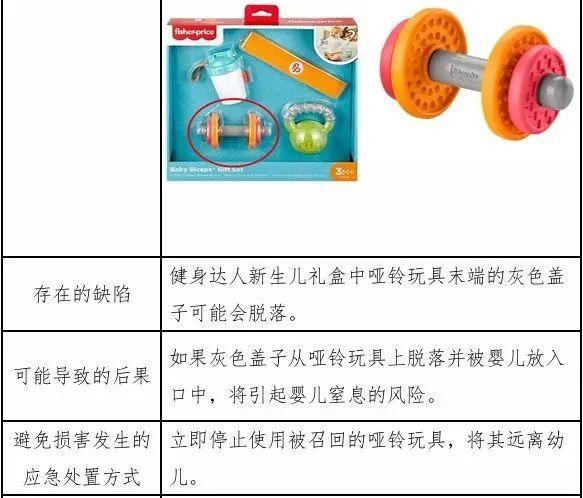 原因在于健身达人新生儿礼盒中哑铃玩具末端的灰色盖子可能会脱落,如果灰色盖子从哑铃玩具上脱落并被婴儿放入口中,将引起婴儿窒息的风险。