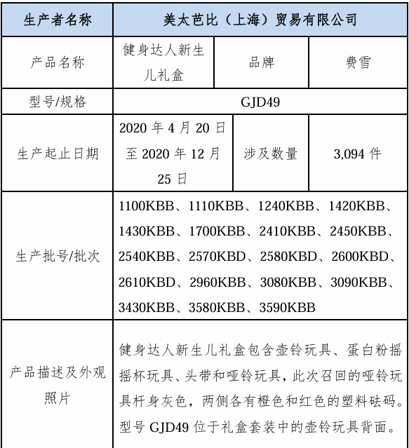 记者查询我国电商平台,并未发现同款商品。另据上海发布9月13日消息,上海市场监管局介绍,美太芭比(上海)贸易有限公司自2024年9月13日至2025年3月12日召回2020年4月20日至2020年12月25日生产的费雪牌健身达人新生儿礼盒,共计3094件。