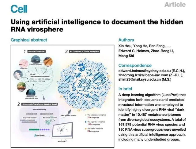 这项经过同行评审的研究10日发表在国际知名学术期刊《细胞》(Cell)上。研究的共同通讯作者中山大学医学院施莽教授告诉记者:“人工智能算法模型使我们能够挖掘出以前未知或被忽视的病毒。这种能力在疾病控制和快速识别新病原体方面尤为重要。”