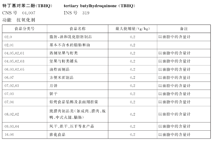 根据我国食品安全国家标准GB 2760-2014《食品添加剂使用标准》,TBHQ最大限量为0.2g/kg,可用于油炸面制品、月饼、膨化食品、坚果与籽类罐头等12个类别的食品中。