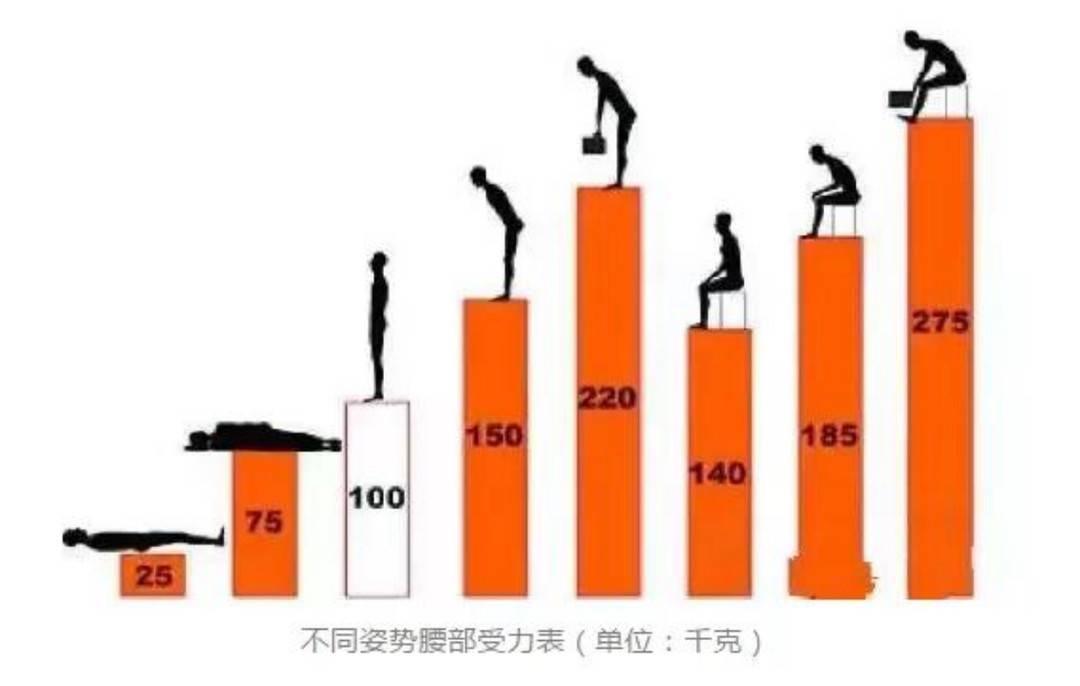 当人体处于不同姿态的时候,脊柱承受的压力是不同的。当保持平躺姿态时,腰椎承受的压力大约占体重的25%;而坐着的时候,腰椎所受的压力是体重的150%。即便同样是坐着,不同坐姿腰椎接受的压力也不同。挺胸收腹,脊柱椎间盘受到的压力相对最小,而处于手臂支撑坐姿、后倾坐姿、前倾坐姿时,椎间盘压力依次增大。所以长时间坐着容易引起腰椎间盘、小关节、肌肉、韧带功能失衡,继之发生腰肌劳损、腰椎间盘突出症等各种腰痛。