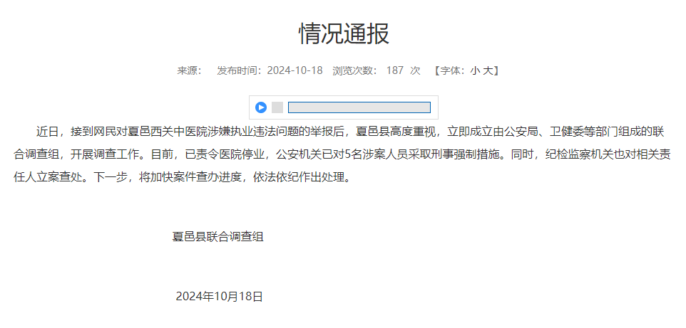 据商丘夏邑县政府官网消息,近日,接到网民对夏邑西关中医院涉嫌执业违法问题的举报后,夏邑县高度重视,立即成立由公安局、卫健委等部门组成的联合调查组,开展调查工作。目前,已责令医院停业,公安机关已对5名涉案人员采取刑事强制措施。同时,纪检监察机关也对相关责任人立案查处。下一步,将加快案件查办进度,依法依纪作出处理。