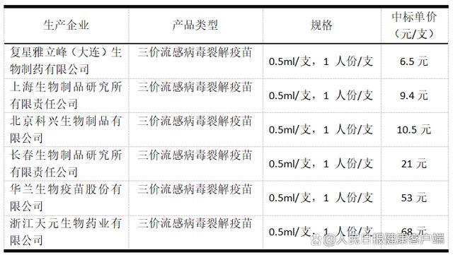 随着流感季到来,各地流感疫苗工作陆续开展,今年各家流感疫苗价格不断下降。据深圳政府采购网最新数据,复星雅立峰的中标价低至6.5元/支。记者不完全统计,截至2024年10月20日,上海生物的三价流感疫苗中标价格已经降至10元以内,长春生物已经降至20元左右,不同产品中标价格甚至相差50元以上。
