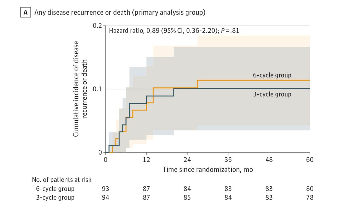 研究和随访时间从2013年一直到2024年,历时超过十年。研究结果显示,在5年无病生存率方面,3疗程组和6疗程组分别为90.4%和89.2%,无显著差异。此外,在5年总生存率方面,两组分别为91.5%和89.3%。在经济负担方面,3疗程组比6疗程组治疗费用更低,能够节省超过40%。
