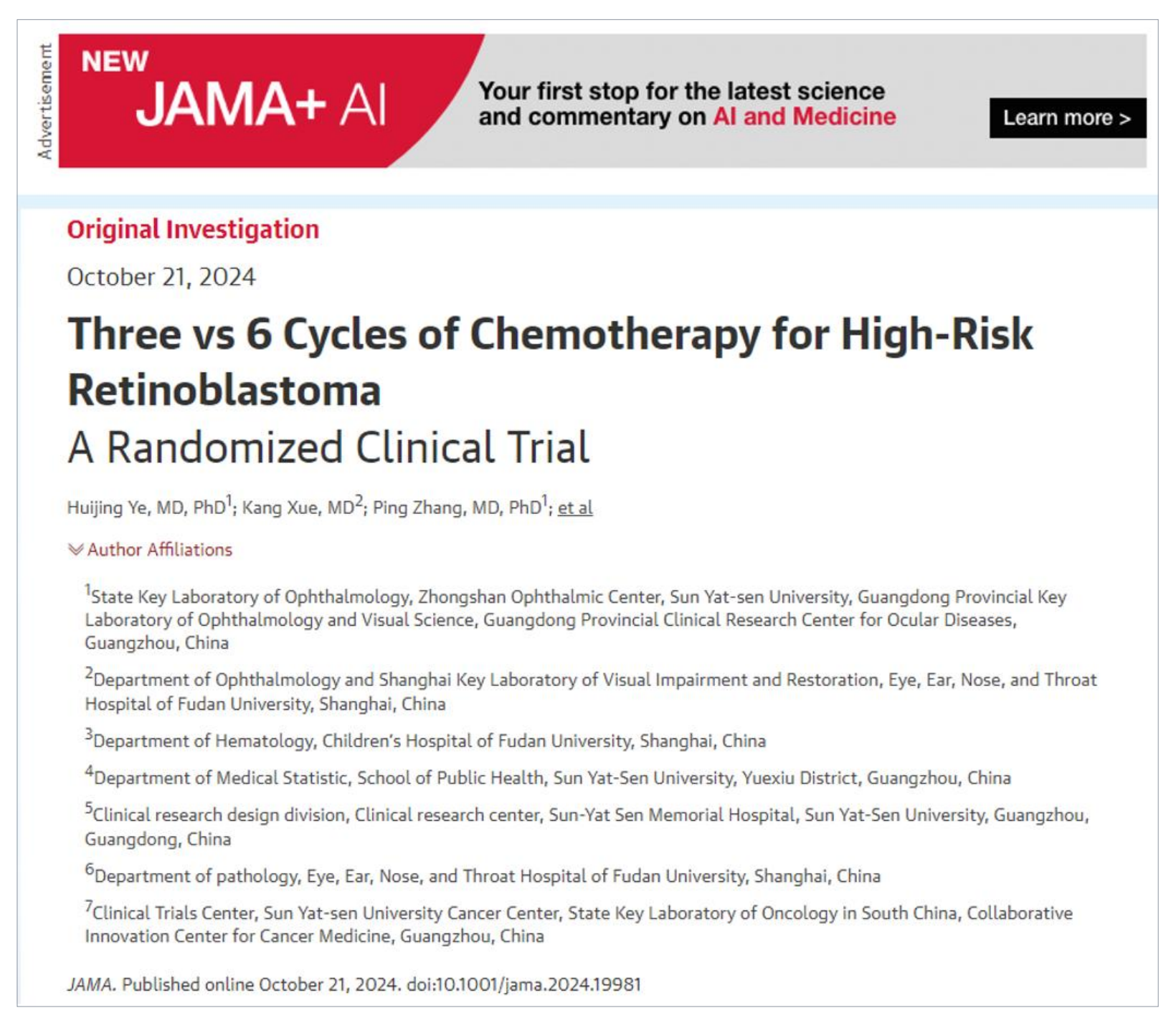10月21日,中山大学中山眼科中心眼眶病与眼肿瘤科杨华胜教授团队和复旦大学附属眼耳鼻喉科医院钱江教授团队在国际顶级医学期刊美国医学会杂志(《JAMA》)发表原创临床研究论文,该研究证实,3个疗程CEV(卡铂、依托泊苷和长春新碱)化疗在预防转移和降低死亡率方面与6个疗程同样有效,且副作用更少,成本更低。