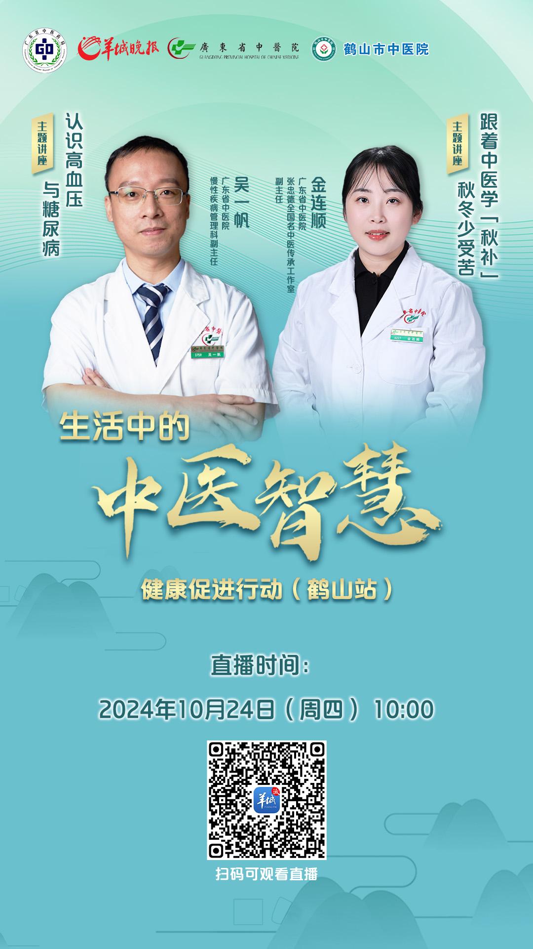 活动现场,广东省中医院张忠德全国名中医传承工作室负责人金连顺副主任医师将带来《跟着中医学“秋补”秋冬少受苦》主题讲座,教你秋冬有效进补,滋润过冬!广东省中医院慢性疾病管理科副主任吴一帆将带来《认识高血压与糖尿病》主题讲座,教你秋冬正确认识并预防高血压和糖尿病!羊城晚报羊城派直播间将进行现场直播,云上共享科普知识。