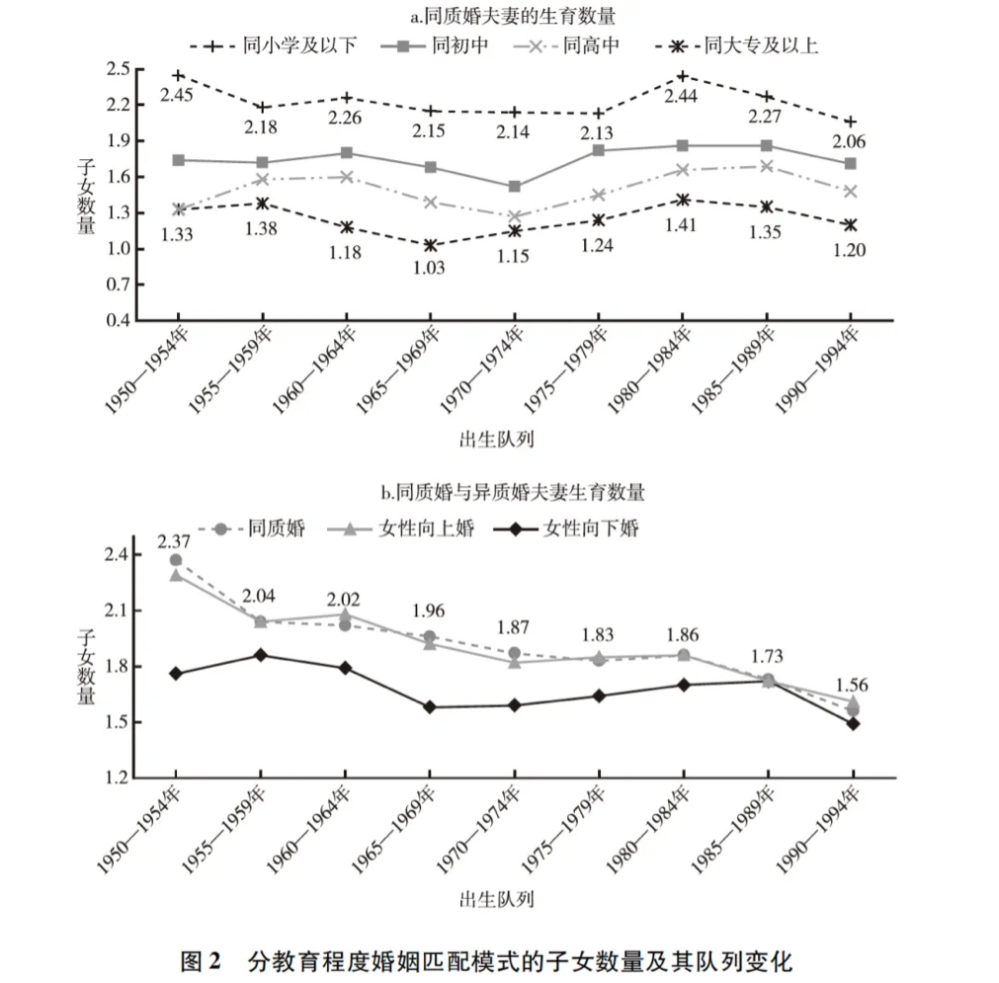 不同教育匹配模式的夫妻间生育差异也显著。研究指出,在同质婚中,教育与生育呈负梯度关系,高学历夫妇的子女数量和二孩生育概率最低。同时,妻子受教育程度高出丈夫越多,二孩生育概率越小。