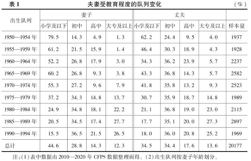 依据研究目的,该研究聚焦于夫妻样本,结合完成正规教育并进入婚育年龄的实际情况,选取了妻子出生于1950—1994年(即26~70岁)的夫妻样本,并以五年为一个单位,将其划分为九个出生队列进行分析。该文整合了2010—2020年的六轮数据,共涵盖20177对夫妻样本(个体样本达40354个),用于描述和分析夫妻教育匹配模式及其队列变化趋势。经过有效筛选和处理,最终有效样本量为12523对夫妻。