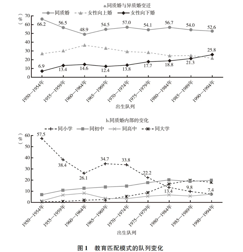 作者通过数据观察到,教育同质婚在中国社会中依然占据着主导地位。在所有出生队列中,绝大部分的队列教育同质婚的比例都达到或超过了50%。不过,在最年轻的夫妇群体(妻子出生于1990—1994年)中,同质婚的占比已从1970—1974年出生队列的57.0%小高峰下降至52.6%。