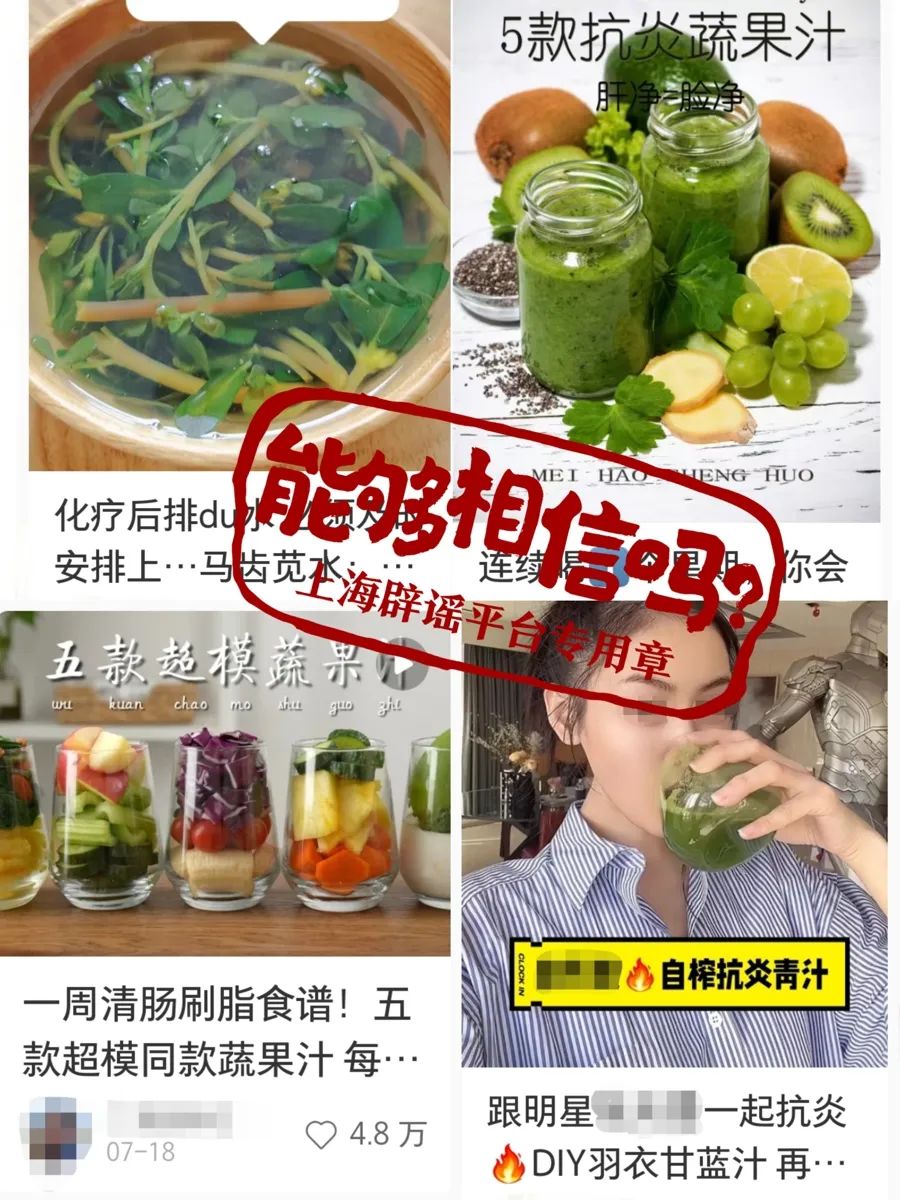 自制果蔬汁风靡全球,近日“生榨蔬菜汁养生法”又在社交媒体上走红,菠菜汁、欧芹汁、羽衣甘蓝汁、马齿苋汁、荠菜汁、苦瓜汁等纷纷一跃成为养生神品。“超模同款蔬菜汁,减肥清肠刷油脂”“每天喝一杯,排毒抗炎增强免疫力”等宣传语让人心动不已。有博主“传授”自己喝生榨蔬菜汁减肥的经历,号召大家每天喝蔬菜汁代替正餐。甚至有博主自称化疗后喝自制马齿苋水,可以排毒、抗辐射。