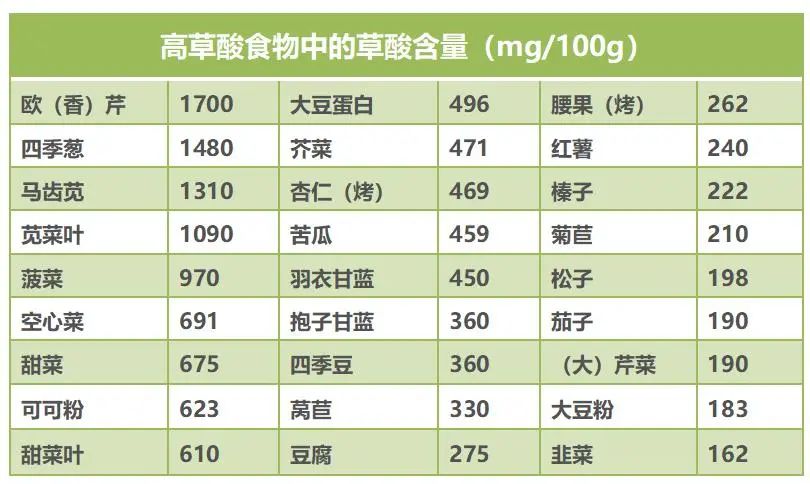一般来说,香芹、苋菜、菠菜等都是草酸含量较高的蔬菜,豆类、粗粮、坚果中的草酸含量也偏高,具体含量可以参考下图。“生榨蔬菜汁”绝不是养生圣品,如果长期喝用欧芹、羽衣甘蓝、马齿苋这样的高草酸蔬菜生榨的汁,那么很有可能会导致肾损伤等一系列问题。