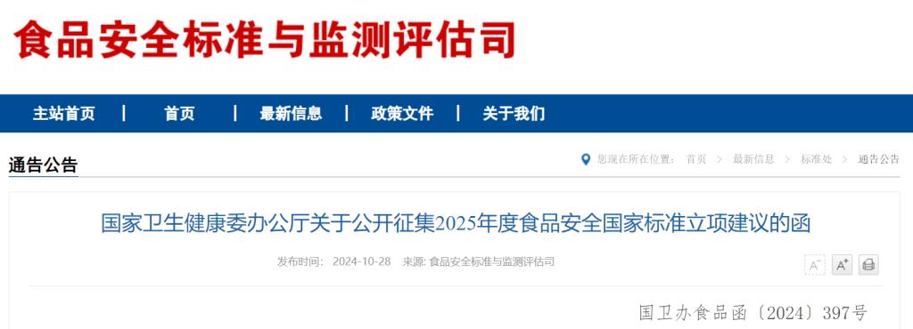 10月28日,国家卫生健康委办公厅公开征集2025年度食品安全国家标准立项建议。以食品添加剂和食品营养强化剂、检验方法、食品产品、微生物、食品相关产品等标准为重点,统筹推进标准制定、修订,使标准范围覆盖我国主要食品类别,涵盖已知安全风险因素。