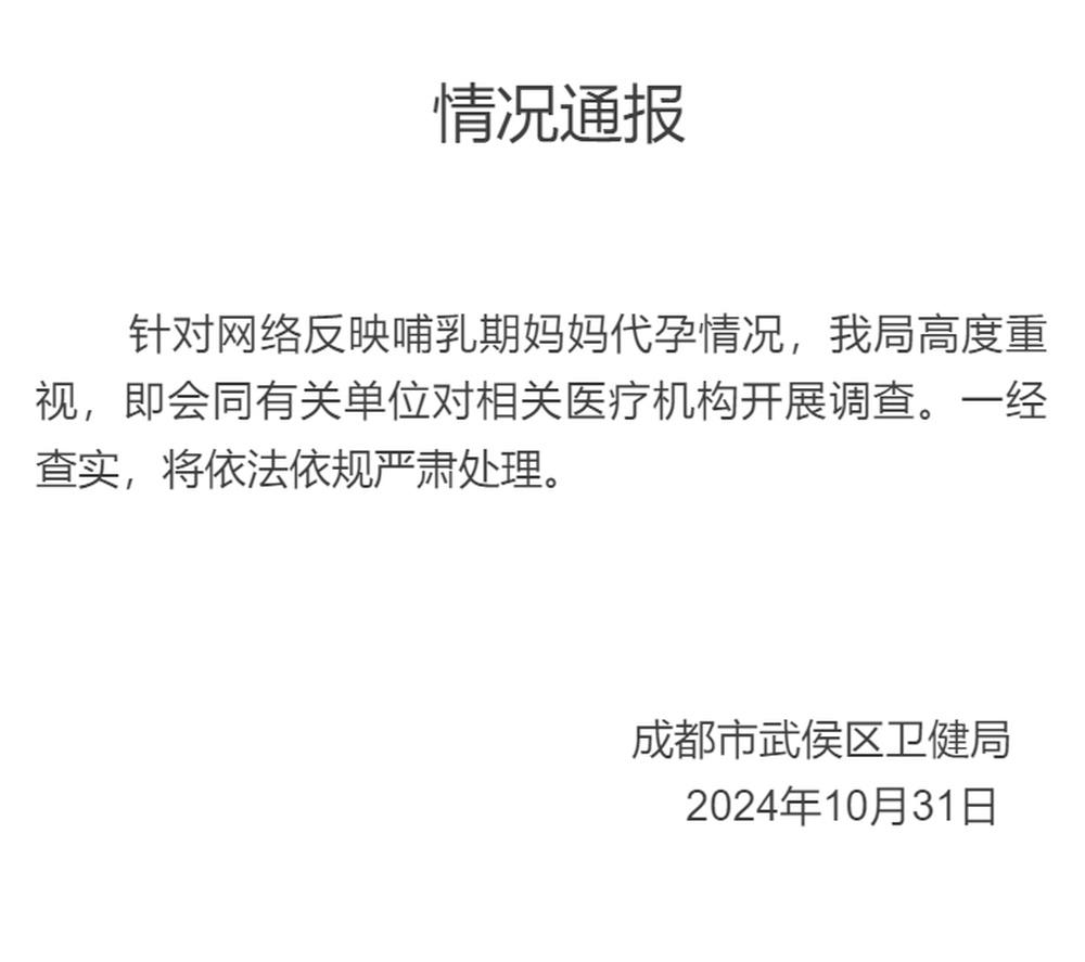 针对此事,成都武侯卫健委微信公号10月31日发布情况通报:会同有关单位对相关医疗机构开展调查,将依法依规严肃处理。