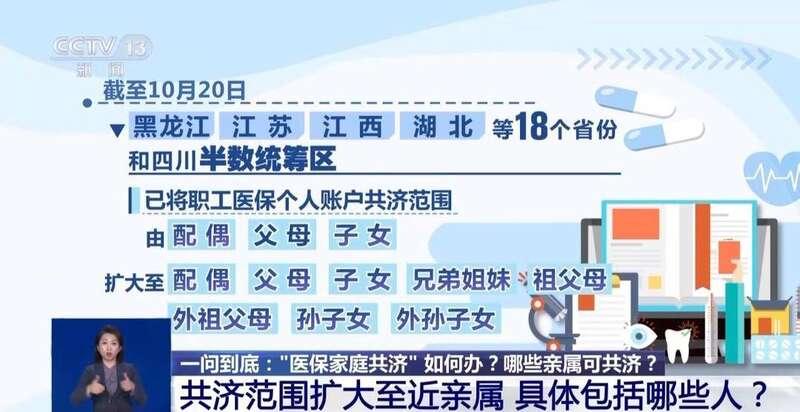 截至10月20日,黑龙江、江苏、江西、湖北等18个省份及四川半数统筹区已将职工医保个人账户共济范围由“配偶、父母、子女”扩大至“配偶、父母、子女、兄弟姐妹、祖父母、外祖父母、孙子女、外孙子女”。
