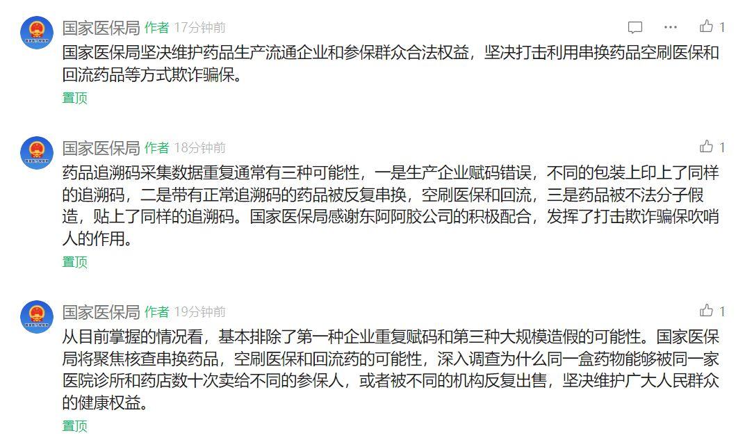 11月3日晚间,国家医保局又在转载东阿阿胶声明的公告中的评论区置顶消息称,“基本排除了企业重复赋码和不法分子大规模造假的可能性”,并称“东阿阿胶发挥了打击欺诈骗保吹哨人的作用”。