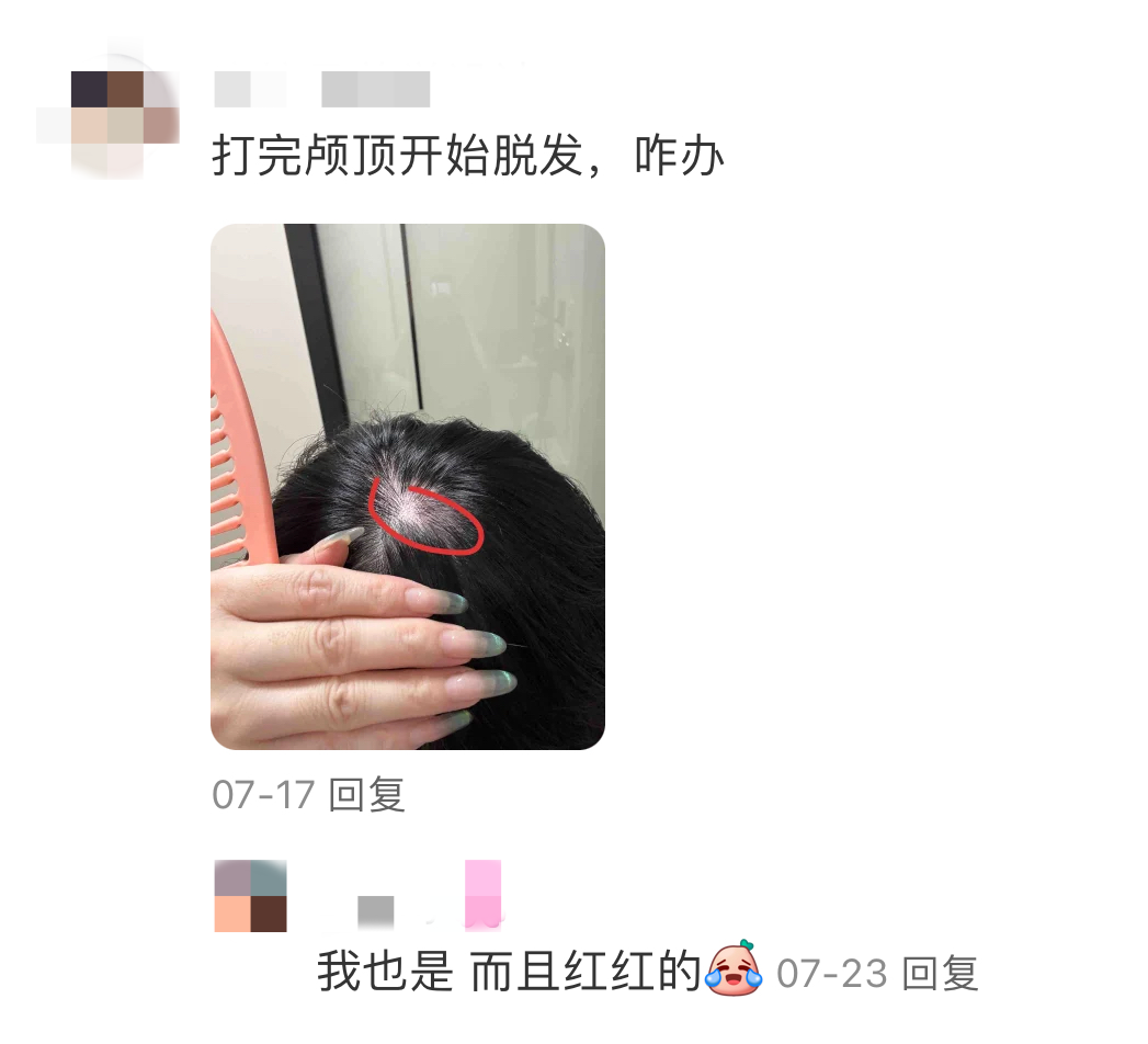 在社交平台上,也有不少网友以过来人的身份发帖,劝其他消费者理性选择:“打完就掉头发了,慎重!”“觉得颅顶低比例不好看,可以通过假发片、植发或者其他装饰品来修饰。”